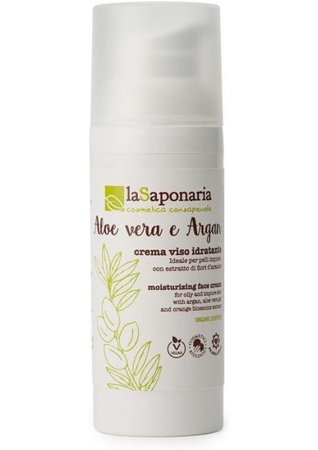 Crema Viso Idratante Aloe Vera e Argan La Saponaria, idratante leggera con aloe vera e olio di argan bio. Perfetta per pelli normali e miste. Formato: 50 mL.
